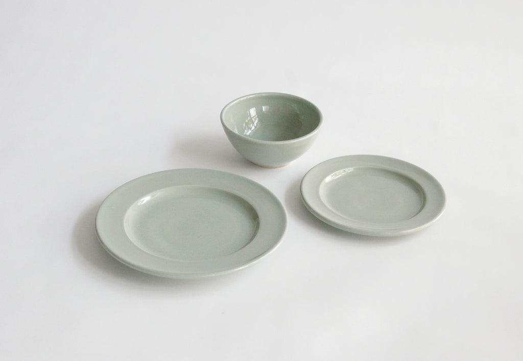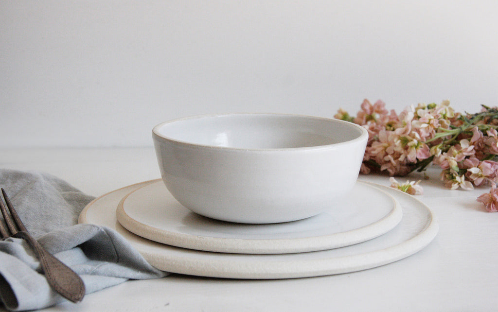 The Silverlake Dinner Set comes with a Silverlake Dinner Plate, Silverlake Salad Plate, and Silverlake Soup Bowl. The exposed clay rims provide a nice contrast to the glaze color of the ceramic dinnerware. Available in 4 of our custom-formulated glazes. Our handmade stoneware sets are the perfect contemporary dinnerware addition to any table.