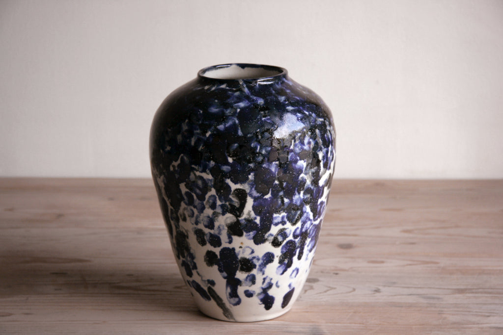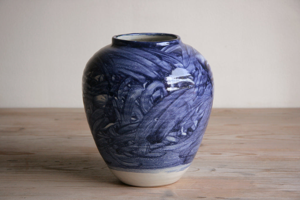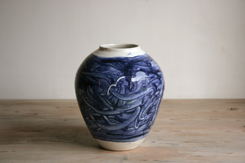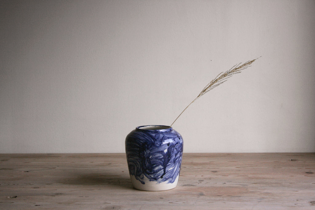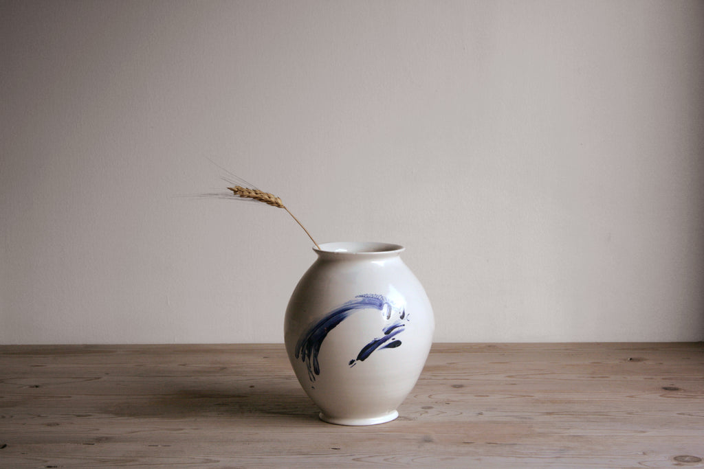 The Cobalt & White Collection is inspired by the classic color combination with a long tradition in ceramics. This vase is made by hand from wheel-thrown stoneware. White slip is layered underneath a coating of clear glaze. Cobalt is applied in expressive ways to form a stunning contrast to the glossy white. This elegant, handmade piece is one-of-a-kind and would make a beautiful addition to any space.